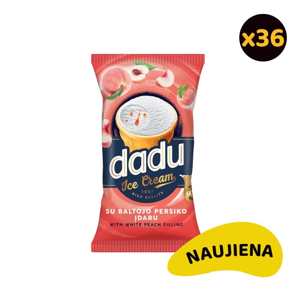 Kam tinka: Idealu 15-kos žmonių komandai savaitei Kas sudaro: Dėžutę sudaro 36 vnt. baltojo persiko skonio ledų kaušelyje DADU Pakuotė: Gamintojo kartoninė dėžutė