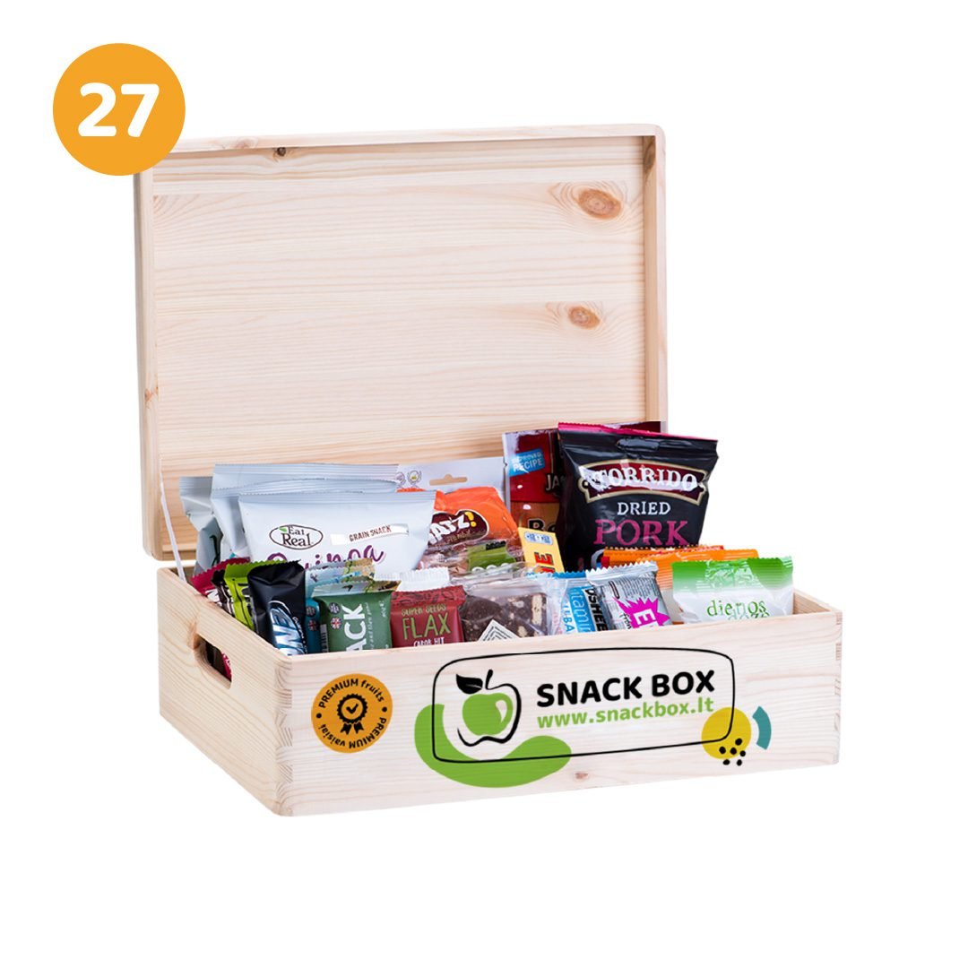 Užkandžių dovana medinėje dėžėje – idėja, kaip nudžiuginti verslo partnerį. Joje rasite įvairius vitaminizuotus užkandžius – dovanosite energiją ir gerą skonį!